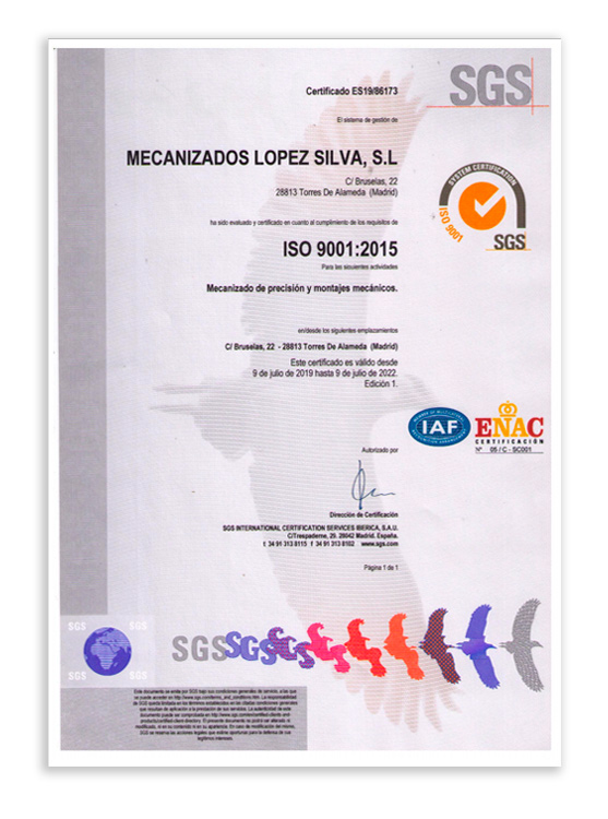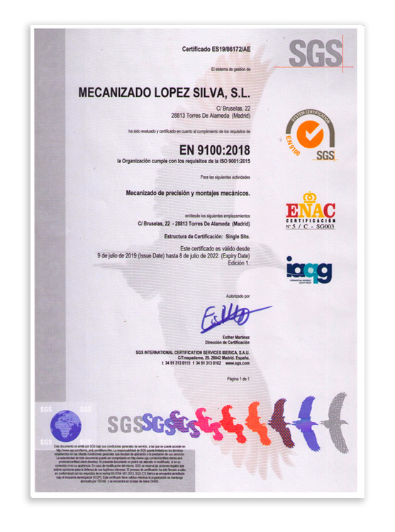 Para garantizar los procesos de gestión y servicio a los clientes el sistema de gestión de López Silva esta basado y certificado conforme a los requisitos de la norma ISO-EN-UNE 9001:2015 y la EN 9100:2018