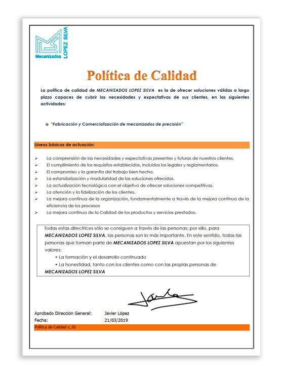 La política de calidad de MECANIZADOS LOPEZ SILVA es la de ofrecer soluciones válidas a largo plazo capaces de cubrir las necesidades y expectativas de sus clientes, en las siguientes actividades: